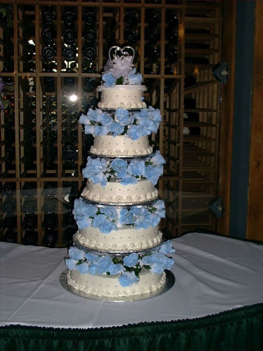 A five tiered (6-8-10-12-14) multi-battered cake french vanilla, chocolate and combination of both.