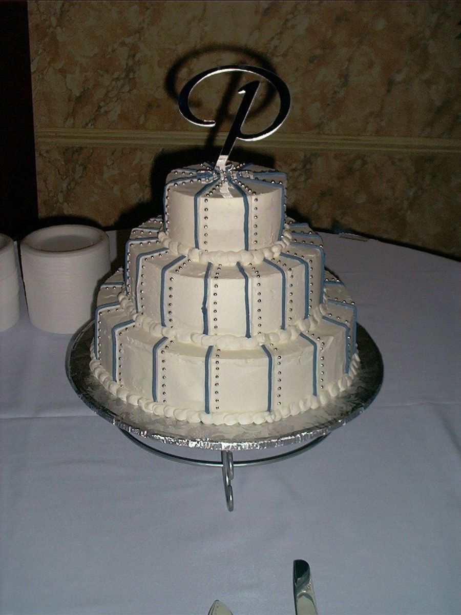 Blue and white wedding cake with stripes make with french vanilla batter and buttercream icing for my best friend's daughter.