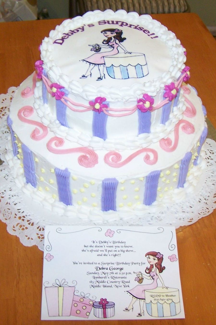 I was asked to make this cake for my sister-in-laws mom's surprise party. They were throwing her the party just because and to also lift her spirits up after going through Kimo. So I got inspired by the invitation. This was my first teir cake I have ever made. I tried to make it have a little of everything that was on the invite, Plus make it look like a hat box, by it being a teir. The tippy top is an edible wafer we ordered from a great website. I was happy for my first teir.