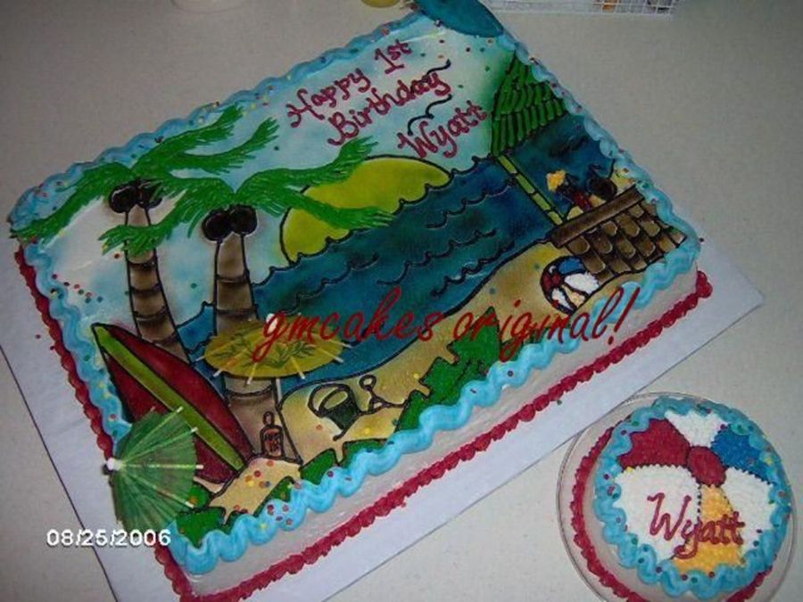 This was kind of hard for me to picture...a luau cake for a boy! The surfboard and tiki hut are suggestions from the boy's mother. The entire design is drawn freehanded and filled in with airbrush coloring. The smash cake was done to resemble a beach ball. I love this cake.