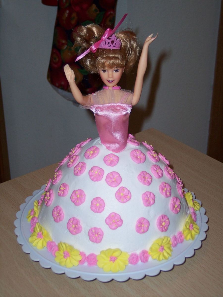 iced with buttercream, apple blossoms were used to decorate the dress the border was made out of apple blossoms and prim roses the top of the dress,necklace, and tiara were purchased