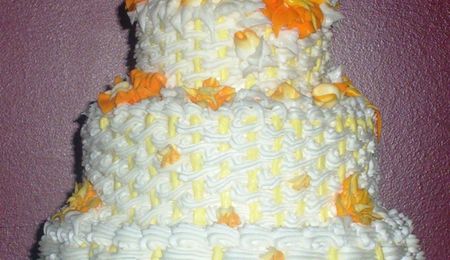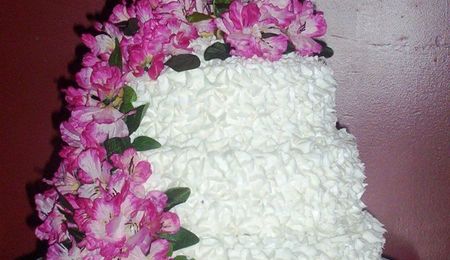 4 TIER CAKE EACH CAKE WAS 3 LAYER FILLED WITH EITHER RASPBERRY PRESERVES OR CHOCOLATE GANACHE. THE FLOWERS ARE SILK TO MATCH THE DECORATIONS AT THE CHURCH WHERE THE RECEPTION WAS HELD. THE SIDES ARE BASKETWEAVE WITH A REVERS SCROLL AND CORNELLI LACE IN THE EMPTY SPACE.