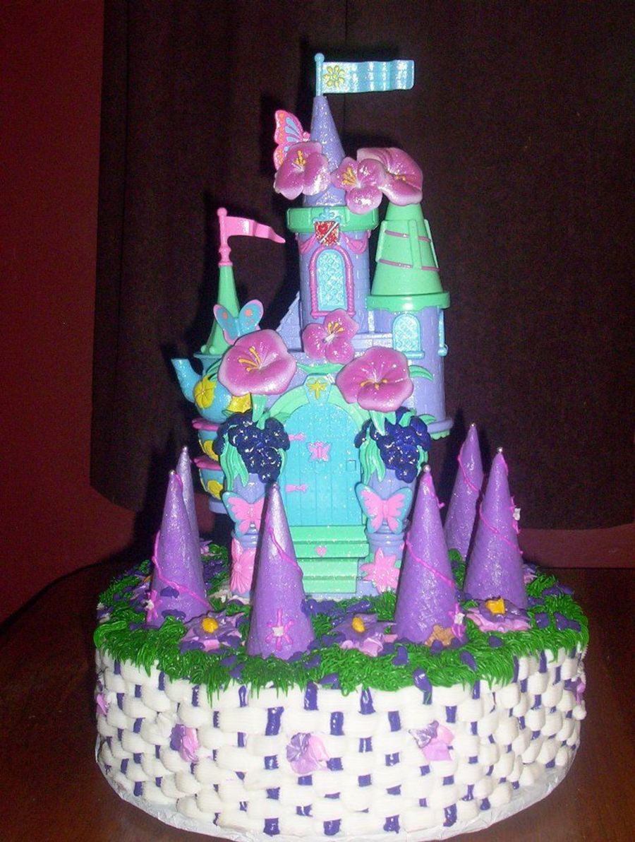 THE CASTLE IS A TOY SET THAT TURNS INTO A TEA CUP SET HOW CUTE. THE CAKE IS MADE IN A PETAL PAN (DONT REMEMBER THE SIZE THOUGH) 2 LAYERS WITH BC. THE PURPLE POINTY THINGS ARE ICE CREAM CONED COVERED IN PURPLE ROYAL ICING. THEN LUSTER DUSTED WITH SILVER TO SPARKLE LIKE THE CASTLE AND THEN SPRINKLED EDIBLE GLITTER ALL OVER.