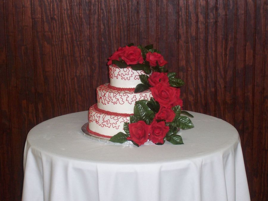 The bride specifically asked for red cornelli lace and red cascading roses. I wasn't sure how it would look, but it turned out okay.