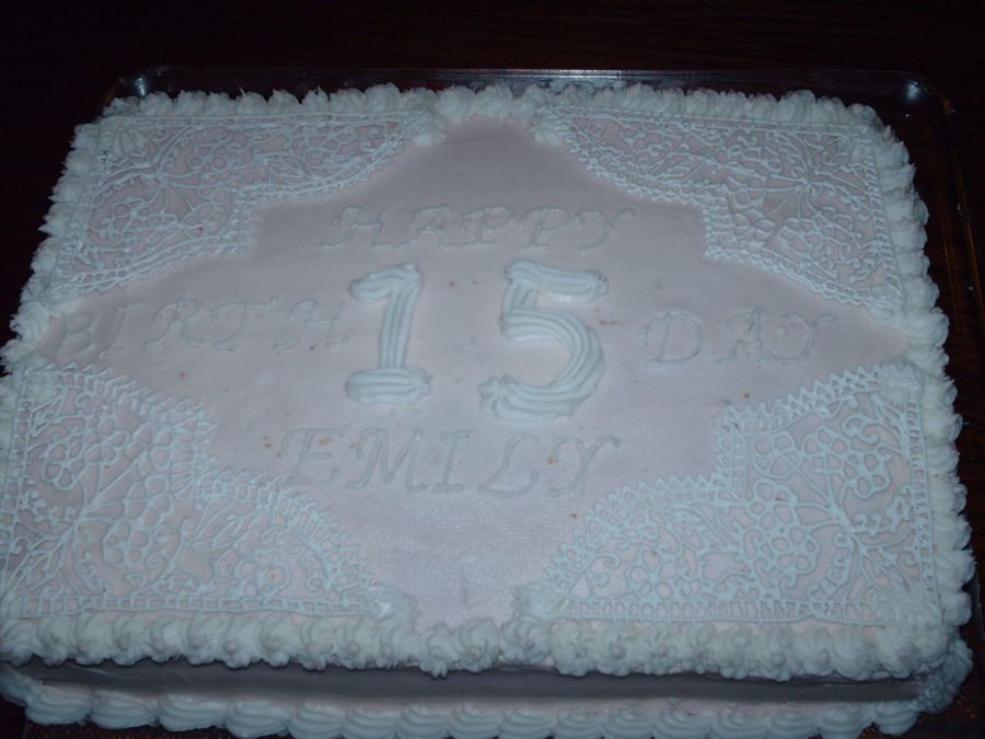 This is my birthday cake. I'm the only one who makes cakes at my house so I make my birthday cakes. The lace is royal every thing else is butercream. I couldn't get a very good picture it looked better in person. (not that it look marvelous in person but it did look a little better)