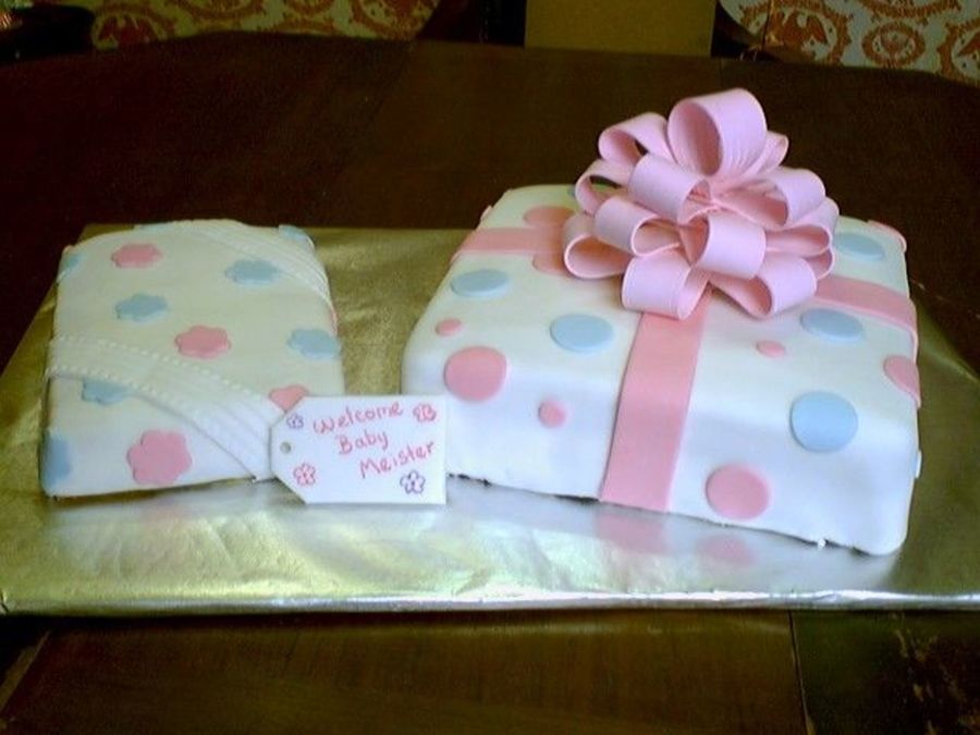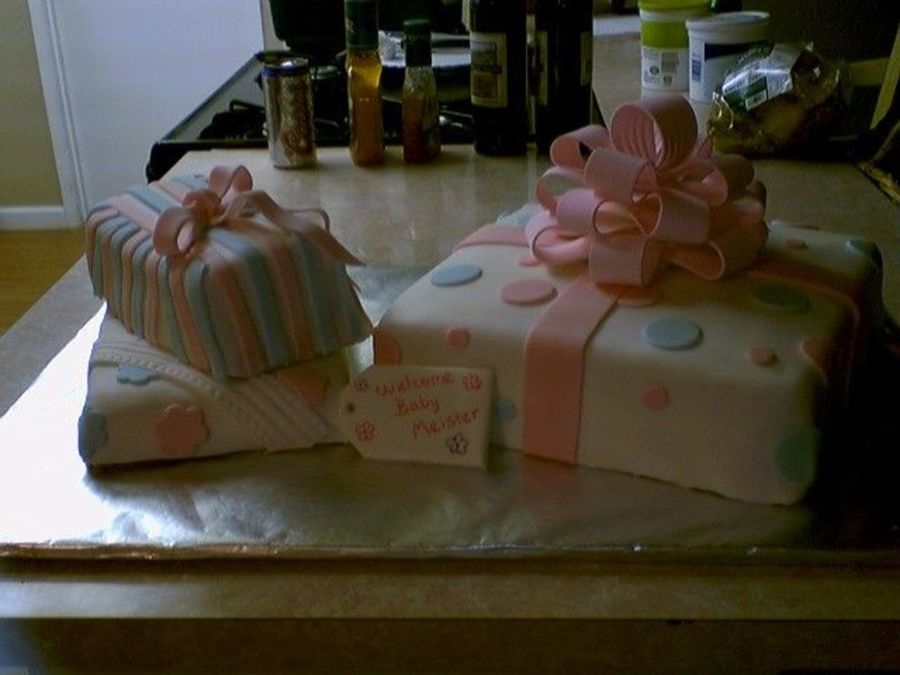 I made this cake for a friends baby shower. Large cake is chocolate, with chocolate filling, top let cake is strawberry with strawberry preserves filling, bottom left is vanilla cake with lemon filling. All cakes are covered in fondant. Large bow is premade Wilton. Thank you to everyone on this site (esp. Kitagrl) for all of the ideas for this cake!
