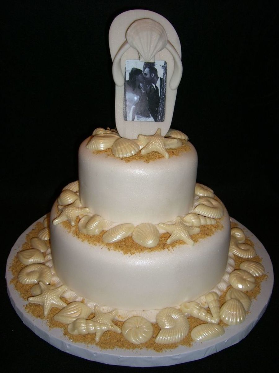 Here is my first wedding cake. It's a White Russian cake with ganache filling. It's covered in mmf. The shells are white chocolate luster dusted. The topper is a picture frame. The sand is ground up grahm crackers.
