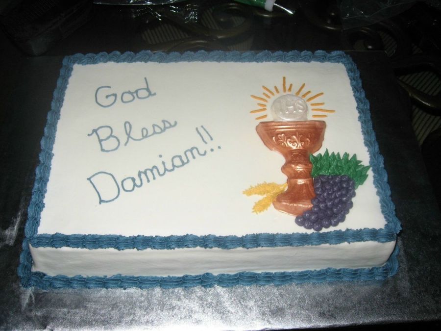 This was made for a family friend. Very simple first communion cake! The chalice in white chocolate.