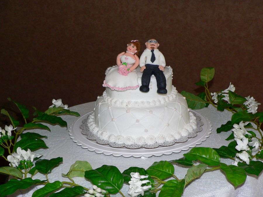 My niece had a very informal wedding for family. I made this practice cake my first attempt at fondant bride and groom. A lot of mistakes but I also learned a lot. The cake was good. Pound cake with strawbarry filling. Thanks for looking.