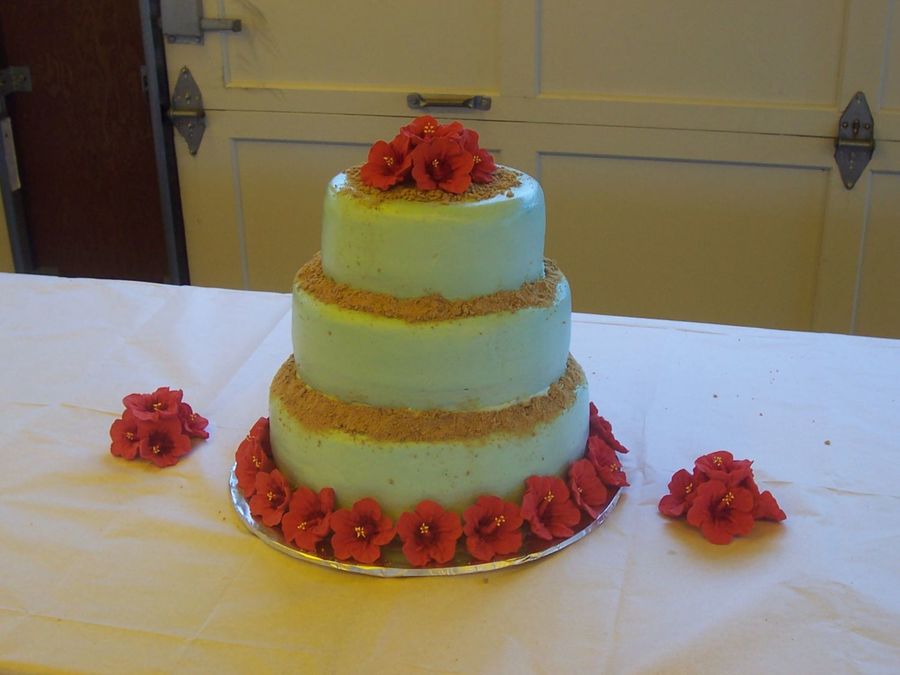 Bottom layer is dark chocolate with chocolate ganache, middle is coconut rum cake with coconut cream filling, top is pineapple cake with pineapple filling, all iced in bc. hibiscus flowers are royal icing, with graham cracker sand. this one was fun, wish my icing was a bit more blue.
