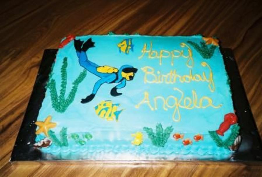 The scuba diver is made with color flow. This was actually a banana cake with banana creme filling. I thought it would be odd with blue frosting, but it was so yummy.