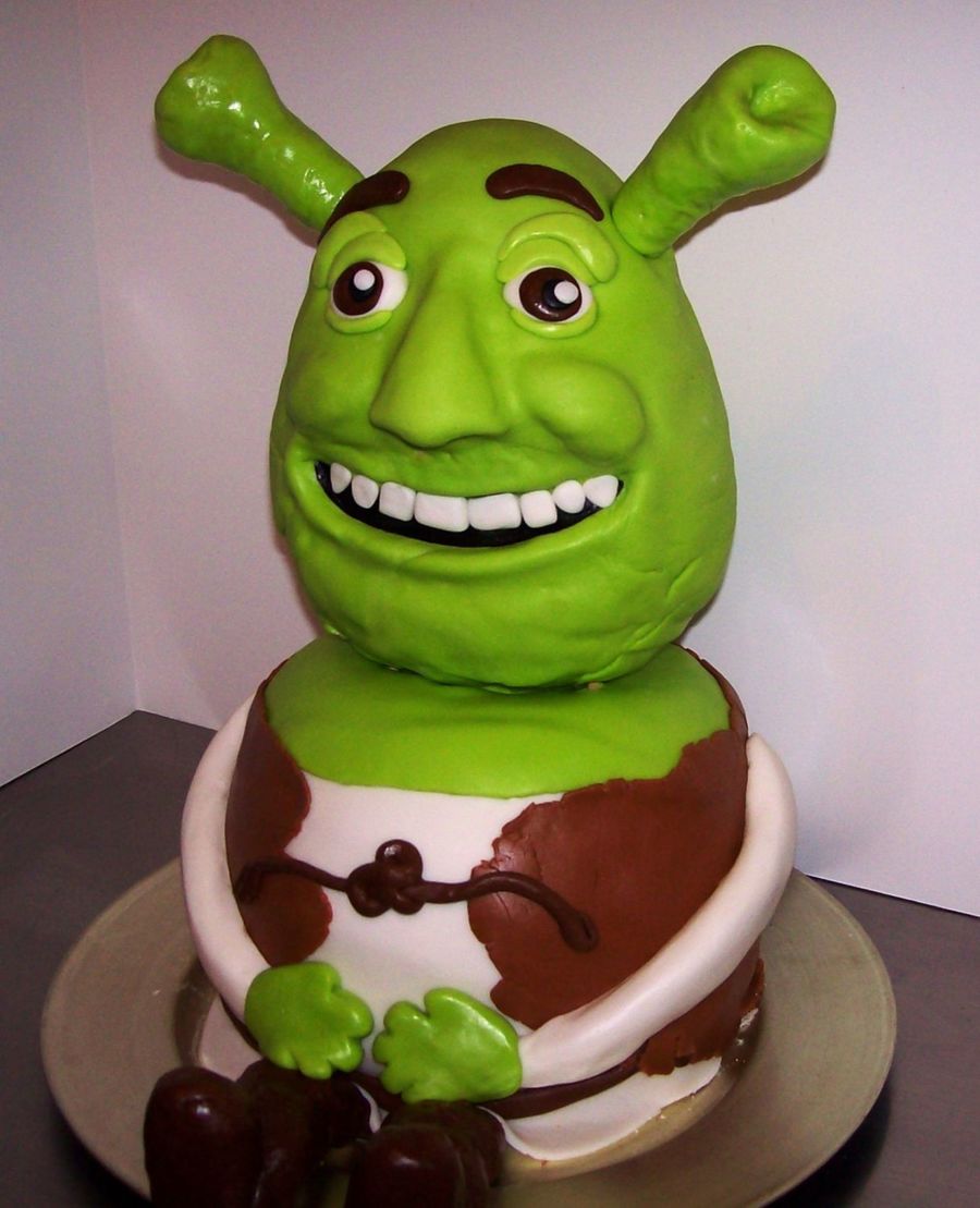 My first attempt at carving a Shrek cake. Head is rice krispie treats, but it was still WAY heavy and had to prop it up seriously on the body part of the cake. A fun cake to make.
