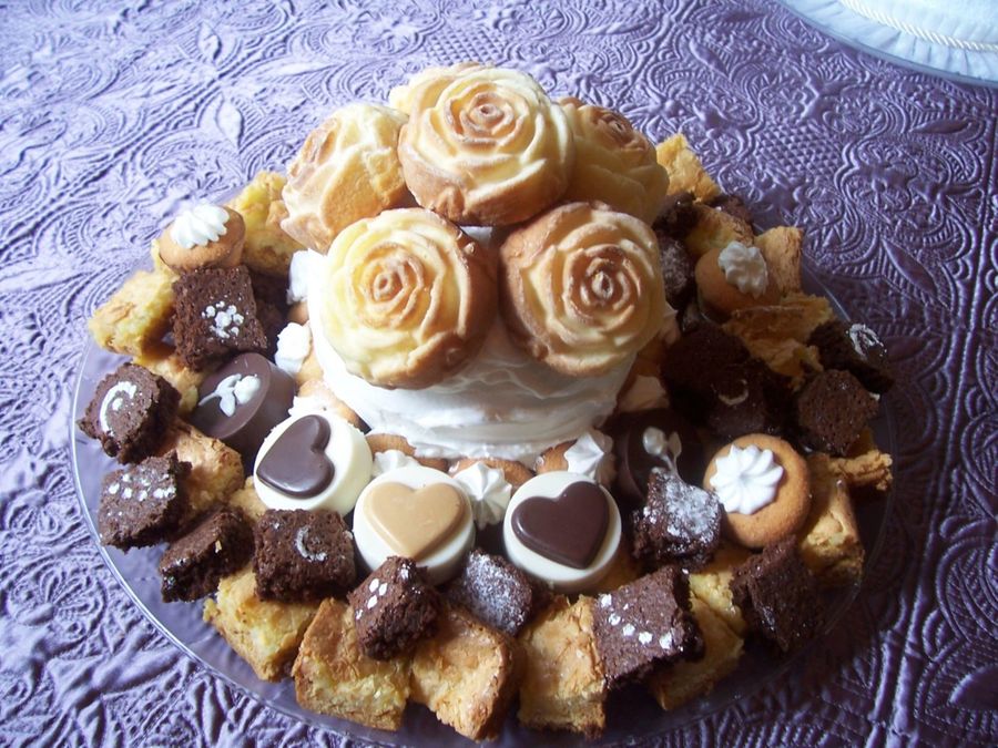 roses were done in silicone mold and placed on small cake. surrounded by brownies & chocolate covered oreos