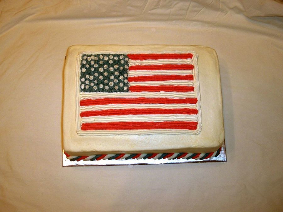 This is a cake modeled slightly after the Old Glory cake in the Wilton 2006 Yearbook. It is three layers 1 Red 1 Blue and 1 White The flag is as accurate as I could get it. It has 50 stars and 13 stripes. I had difficulty getting the colors to come out dark enough but I am still happy with the end product. All of the icing is butter cream and the bottom of the cake is a Red, White, and Blue rope border.
