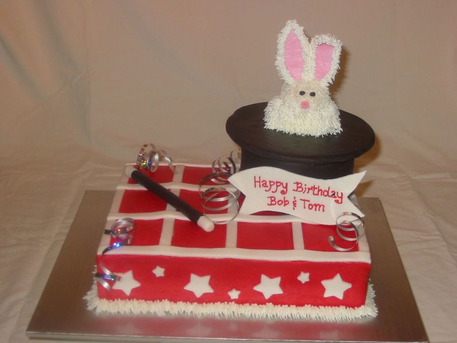 1/4 sheet cake (two layers with bc filling) is covered in bc with fondant stripes and fondant stars. Hat is round cake covered in fondant with a circle cardboard covered in fondant for the brim of the hat. Bunny is a cupcake (head) and twinkie (body) covered in bc with a grass (233) tip, and the ears are carboard covered with foil, then piped with bc using grass tip. Magic wand is fonant (dried in a dehydrator) and birthday sign is 50/50 with bc writing. Curling ribbon was added for a finishing touch.