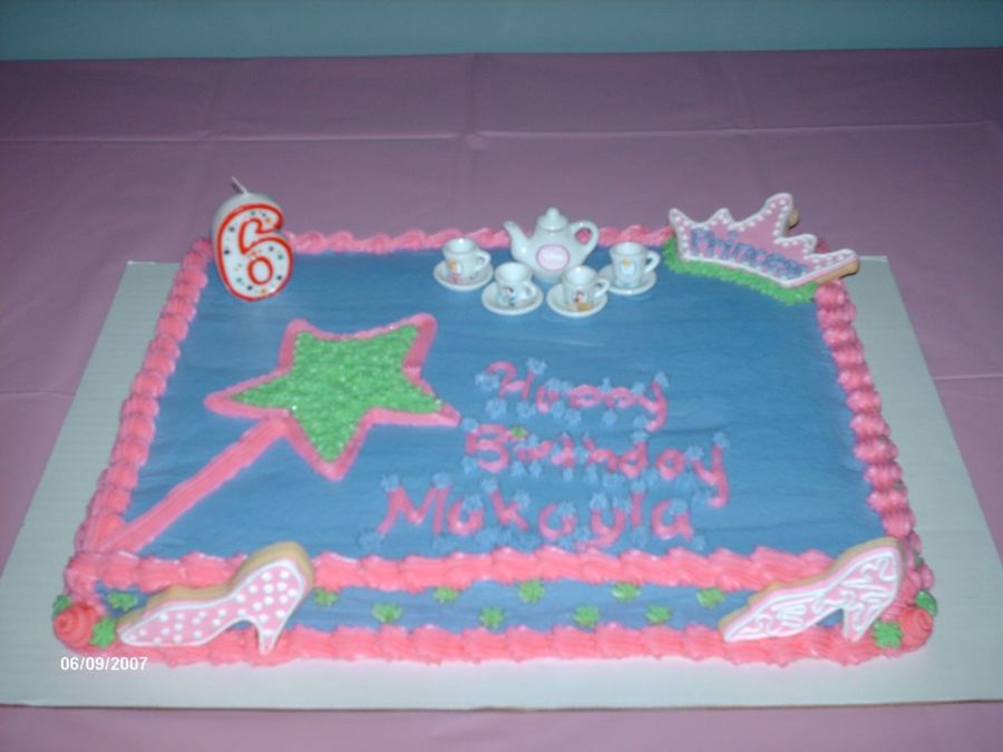 Yellow sheet cake with buttercream icing. This was for a princess birthday tea party.