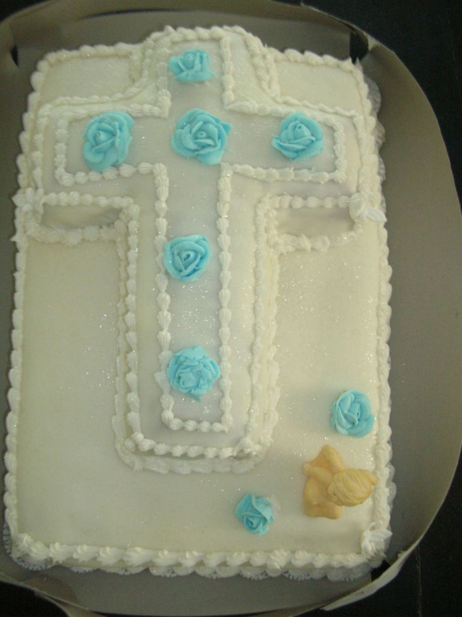 I did this for my friend's son's baptism. LOTS OF CAKE. I tried a crusting cream cheese icing for the 1st time and guess what? It didn't crust. So, I rean to the store and bought a box of fondant and rolled it out to cover the NON crusting icing and threw the roses on it and some sparkles and out the door I went. The cake was white cake with a fresh strawberry filling. Very yummy just a lot of hair pulled out.