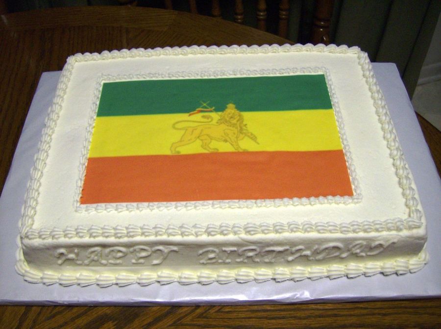 This birthday cake is for a woman's boyfriend, who is from Jamaica. Cheesecake pudding mix added to butter cake mix, crusting cream cheese icing, with an edible image.