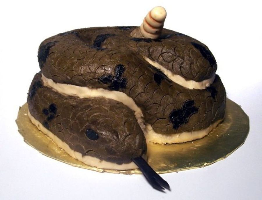 This was a last minute order for a small cake of a little boy who loved snakes, just 2-8" cakes carved to resemble a coiled up snake. All buttercream (two-toned) with black food coloring painted on. The scales are made with the impression of an upside down tip. Fondant tongue and rattler.