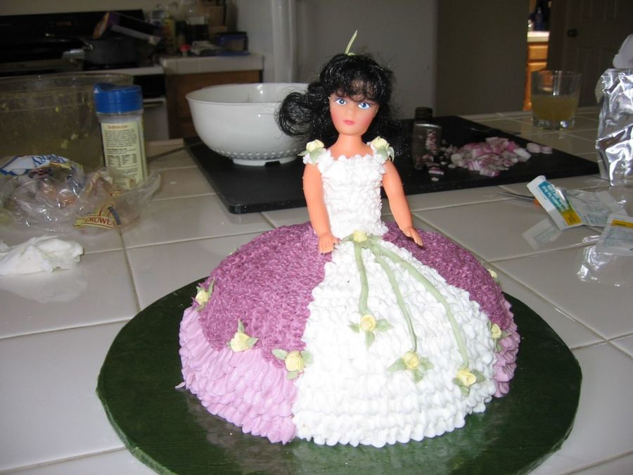 Aaah! I almost couldn't bare to post this cake! It is my first doll cake, and I baked it in a bowl...so it gave a really funny dress shape, but decorating it was still fun!
