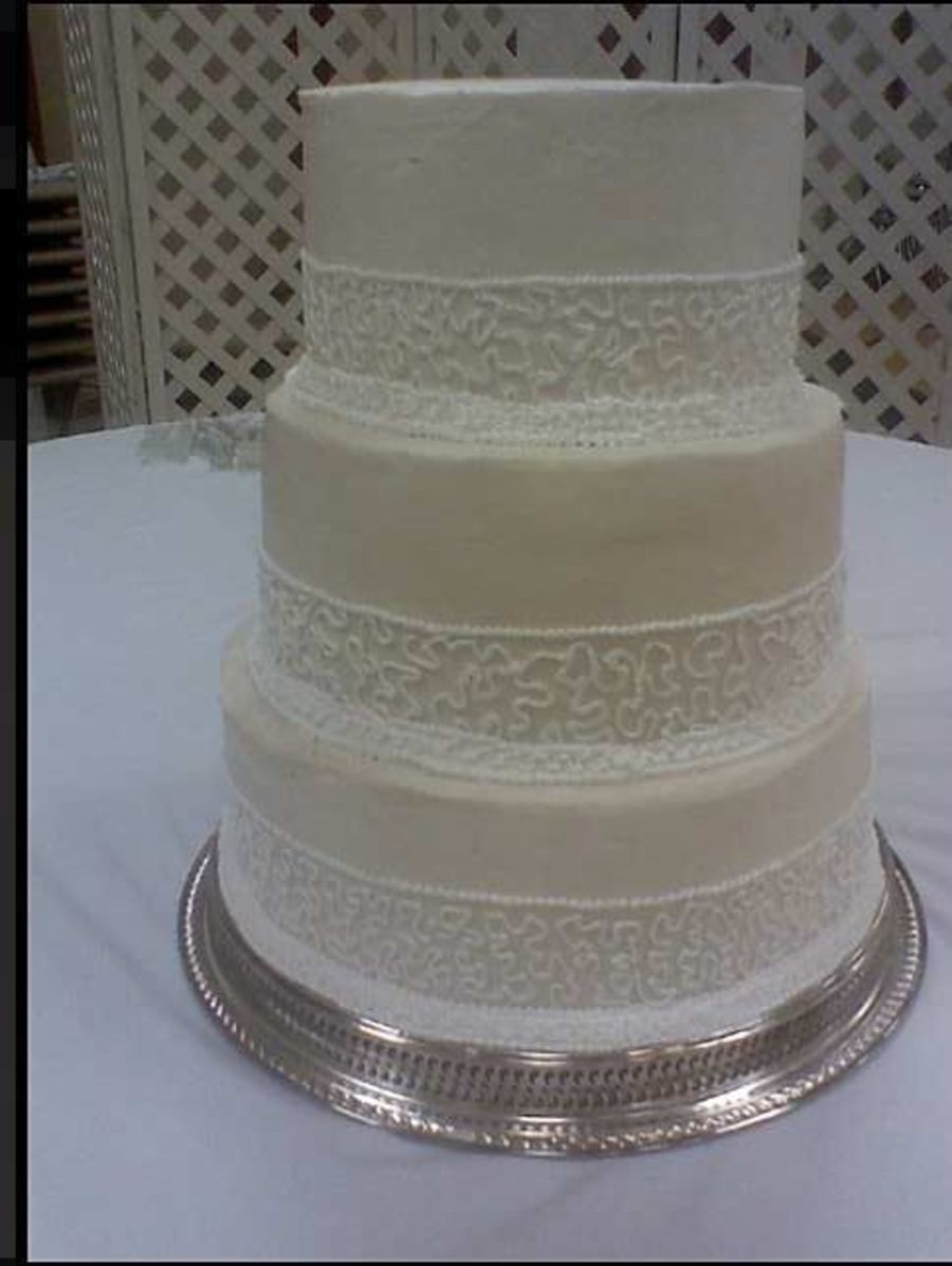 I really love how this cake turned out. I have cream colored butter cream frosting with some cornelli lace accented in bright white.