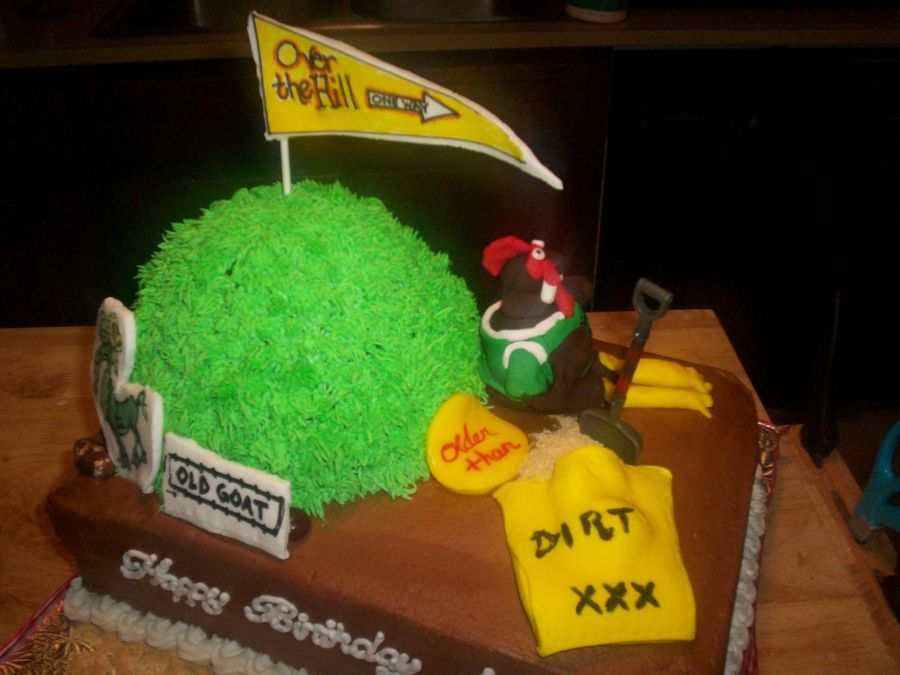 The customer wanted an "Over the Hill" or "Older than Dirt" cake for her father-in-law. I just combined the two. I also made an over the hill "spring chicken" and and an "old goat".