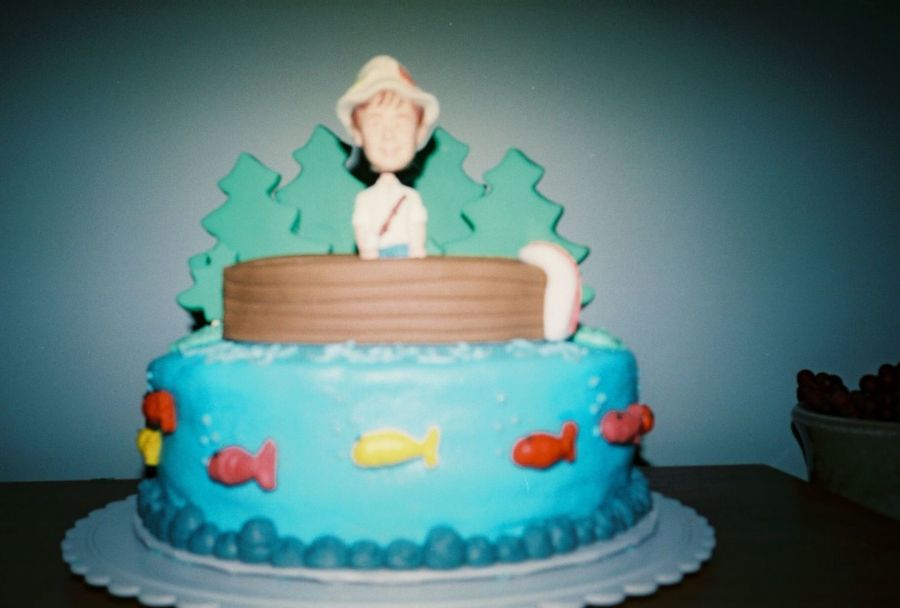 Butterpecan cake with buttercream icing. Boat and trees are made out of fondant. Fisherman is a bobble head.