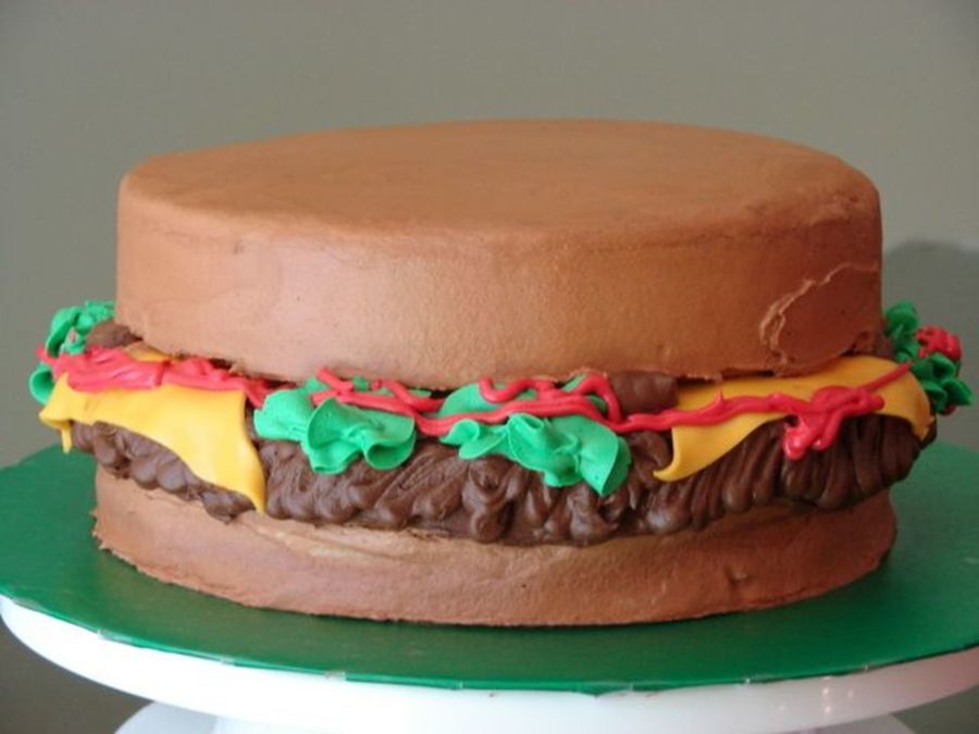 I have been wanting to do a cheeseburger cake, so here is my attempt. I will make another one and I have learned from this one. My top and bottom bun are 8" pans and the hamburger patty is a 9" pan. All buttercream except for the cheese which is MMF. I would do the ketchup differently next time. French Vanilla cake with French Vanilla creamer and cake mix.