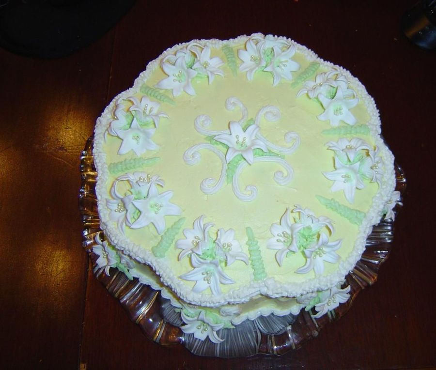 This is buttercream (before I learned how to smooth it!) with royal icing lilies. I can't remember exactly where I got the design but I think it was a Wilton book.