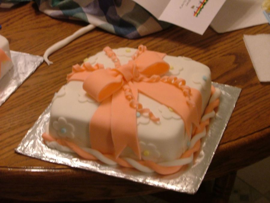 This was my first fondant cake. I was the first cake that I made during Wilton's 3rd course. It was white cake with white frosting. Sorry the picture is a little blurry.