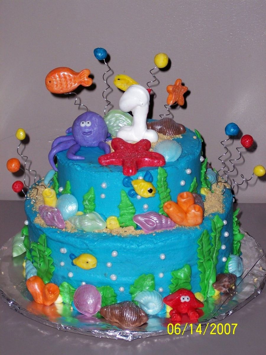 This cake was soooooo much fun to do. I initially panicked over thinking of making the animals, etc., but I'm pretty pleased with the outcome. The cake is a 6" coconut layer with vanilla butter cream filing and a 9" french vanilla layer with vanilla butter cream filling. Icing is vanilla butter cream. All decorations are fondant, dusted with super pearl, except for the shells that are candy melt molds and dusted with super pearl. Thanks for looking!