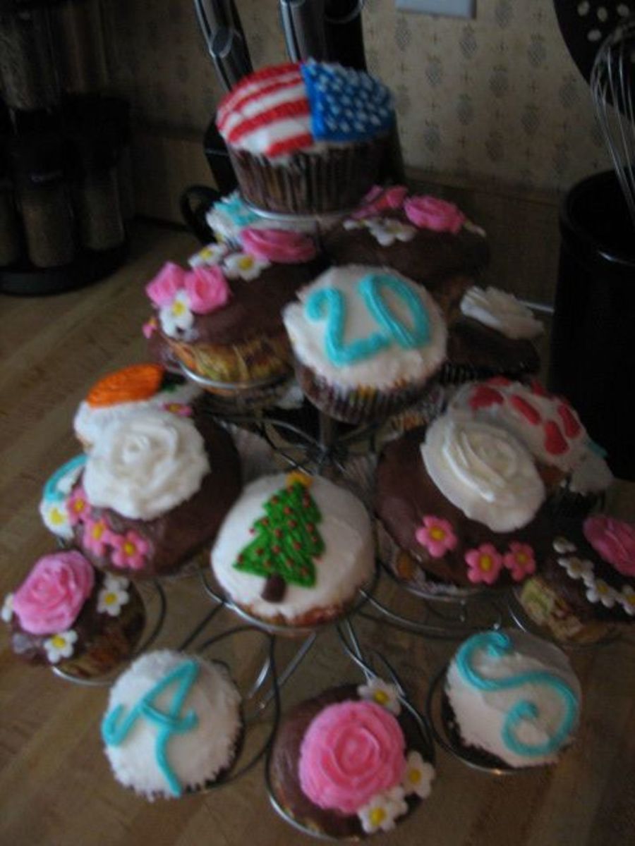 This cake was created for my cousins return from Iraq party. It contains pretty cupcakes that spell out her name as well as cupcakes for all the different holidays she missed while serving our country. It was fun to make since I got to try so many different ideas out.