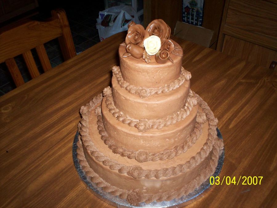 White almond sour cream & chocolate fudge almond sour cream cake, torted w/chocolate mousse filling, & finally smothered w/heavenly fudge icing. The roses are chocolate & white Tootsie Rolls. This was the first tiered cake & the first Tootsie Roll roses I had ever made. It was for my DH's retirement. He wanted it to look like there were ropes w/knots around the cake. The roses were my idea for the kids - LOL. It's not perfect but everyone liked it & we had fun. Thanks for looking & critiquing!