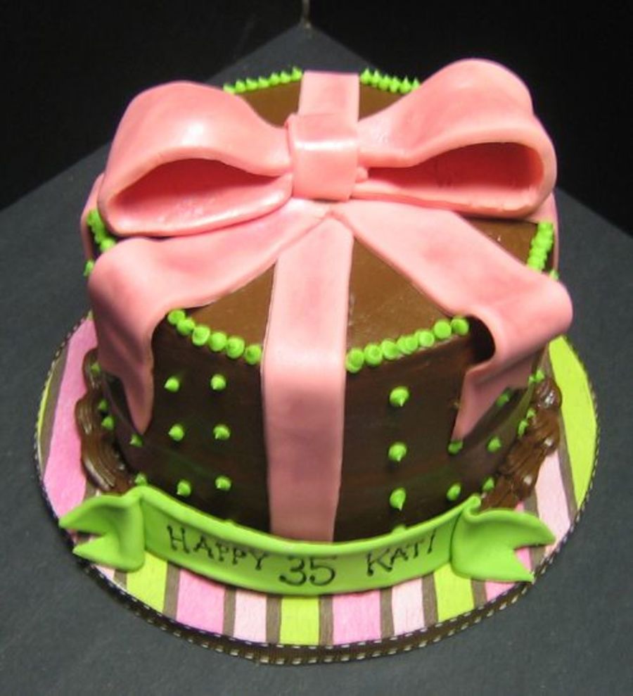 6" white cake with raspberry filling and chocolate frosting (the chocolate syrup recipe from this site - YUM!). Ribbon and banner are fondant.
