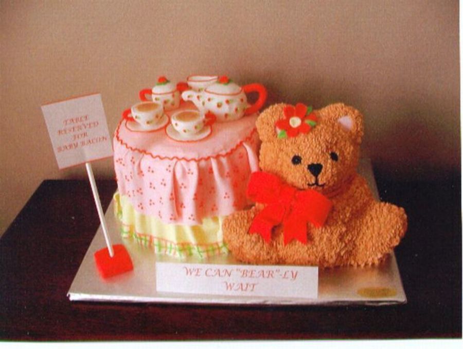 The table was made using 2- 8" rounds iced in bc with fondant folds for the tablecloth. The tea set made of fondant and the bear was baked in the stand up bear pan. Thanks for compliments!!