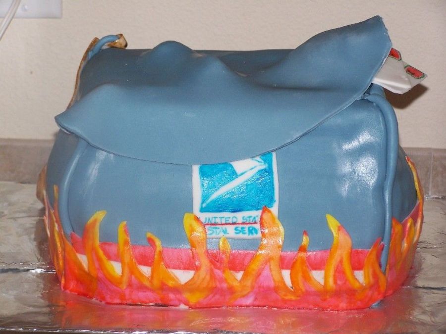 Retirement cake for my dad, he was a mailman. Its his mail bag on fire.
