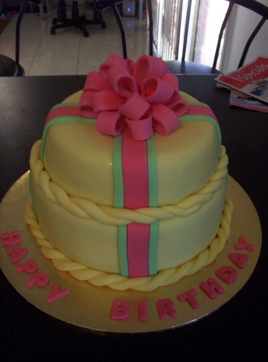 This was my first attempt at a stacked cake and the first loop bow i've done. I would have liked the top layer to have been smaller but i didn't have enough notice to go and buy the right size tin. I hope my friend likes it now.