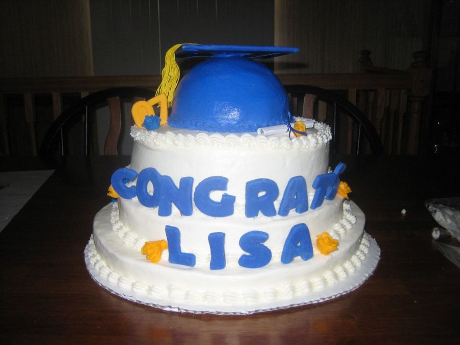 this was done for my cousins graduation party. all three teirs were white cake frosted with buttercream as well as the cap. the lettering was fondant