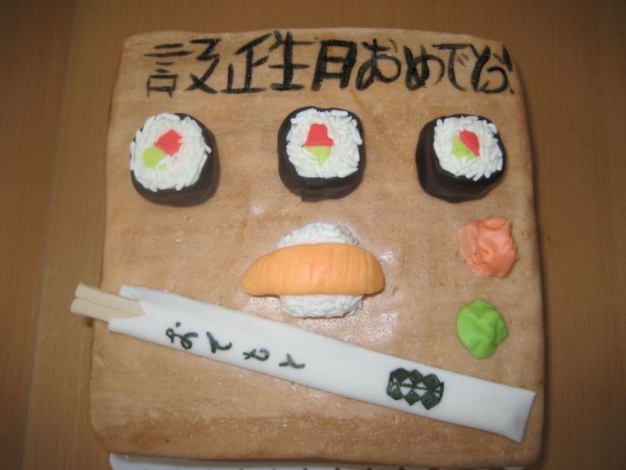 Cake with covered in fondant, with fondant sushi, and chop sticks. It says Happy Birthday in Japanese.