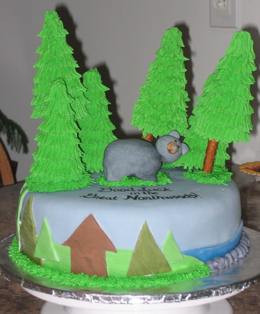 Going away cake for 2 ladies retiring to the Northwoods of Wisconsin. cake is covered in fondant with fondant trees, cabin and lake on the sides. The trees are ice cream cones covered in royal icing with pretzel trunks. The bear is gumpaste. Borders are royal icing and writing is in edible marker.