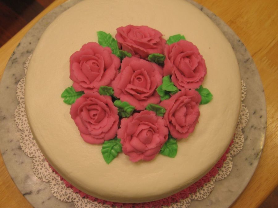 white cake torted and filled with bavarian cream, BC frosting and roses.