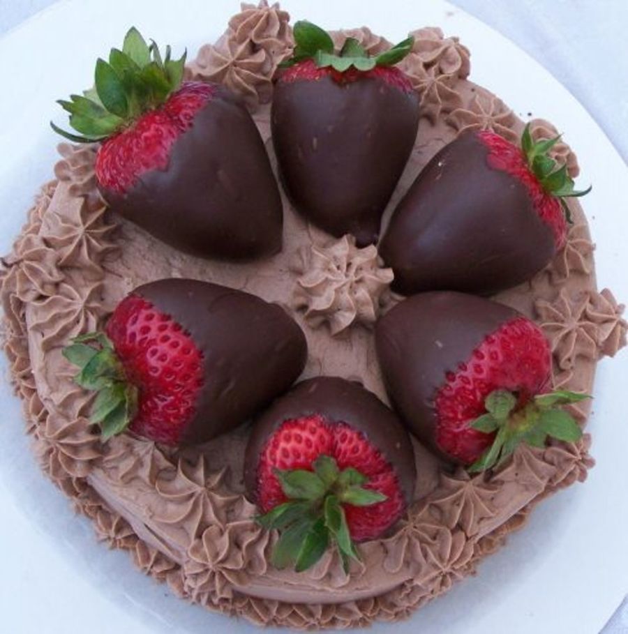 6" dark chocolate cake with chocolate b/c icing. topped with dipped strawberries.