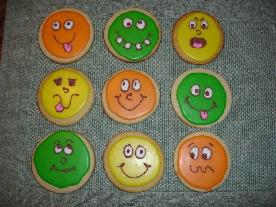 I love the expressions!! I want to try the glaze icing next. Did you outline first or was it prety easy to just flood the cookie all at once. When I outline sometimes I get the line, and it ain't pretty sometimes. :D