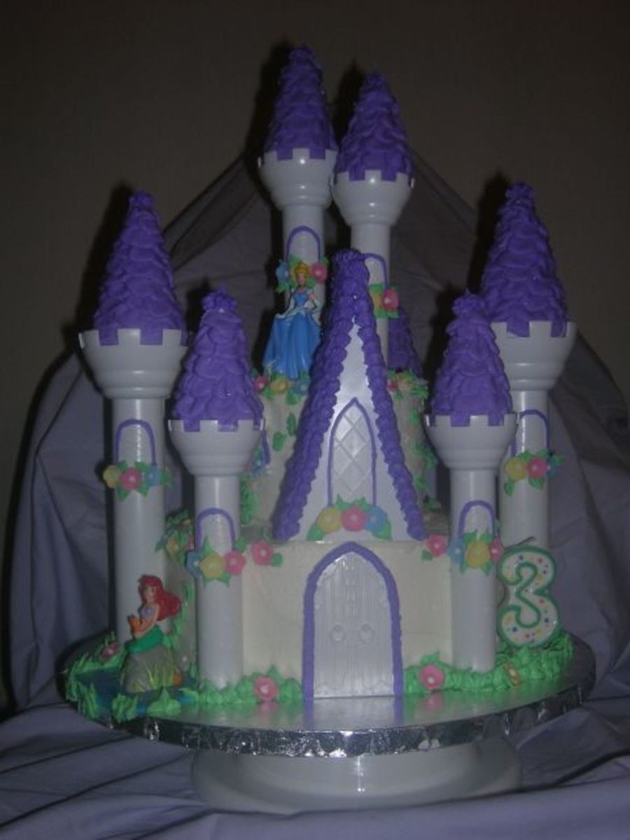 I made this cake for my daughter's 3rd birthday. It's the NEW Wilton Romantic Castle Cake Set, stacked cakes (6 & 10 in) with the 4 princess' kit. I used buttercream icing and fondant flowers.