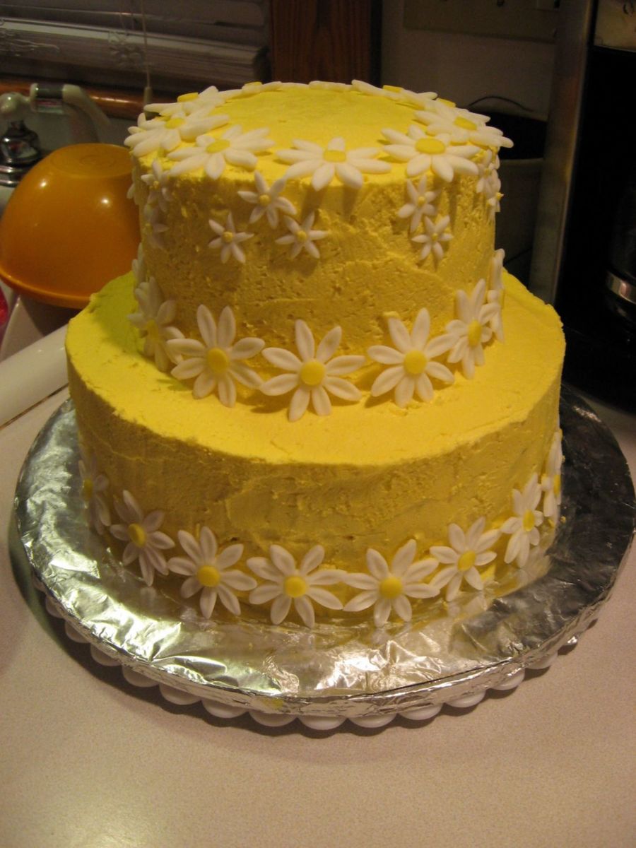 I made this cake for my Grandma's 60th birthday. The daisies are fondant and the icing is buttercream. This is the first time I used a filling in a cake. It is homemade strawberry filling.