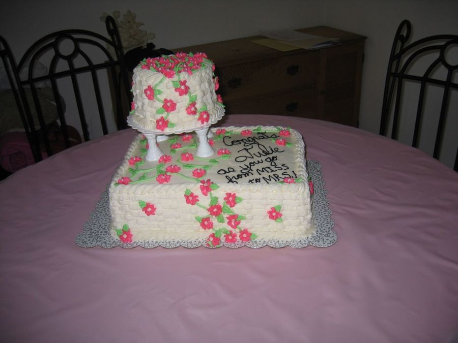 All buttercream. Neopolitan cake with vanilla cream filling between the chocolate, vanilla, and strawberry layers.