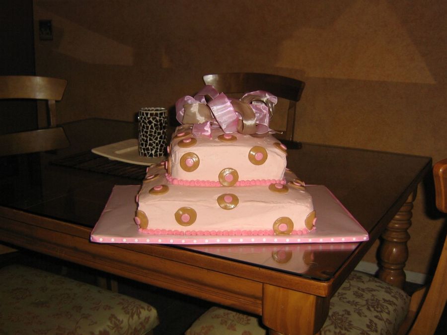 I took the inspiration from the invitation as well a a variety of polka dot cakes I've seen posted on Cake Central. Its a vanilla cake with chocolate cream cheese filling frosted with butter cream with just a tad of almond extract. And of course the polka-ducks(as my nephew calls them) are marshmallow fondant. For the first time I am actually happy with my cake! I still see all the flaws etc, but I feel pretty satisfied.
