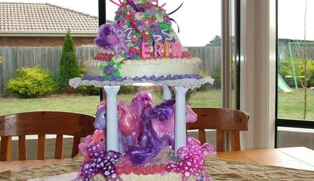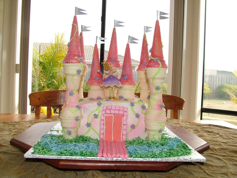 This is a cake I did for My DD 4th Bday..9"Square Cake..Double layer Chocolate, Ice Cream cones dipped in White Chocolate for turrets ..then edible spray on Top of turrets..Decorate with candy bits and pieces