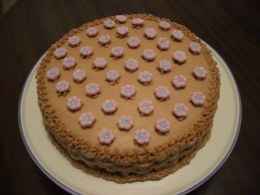 This is my second decorated cake. I have had no formal training - I am just doing this for fun! The cake is devil's food with a fresh raspberry cream filling and chocolate buttercream icing. The flowers are hand shaped fondant with a royal icing center. This was for "girls night in" and they loved it!
