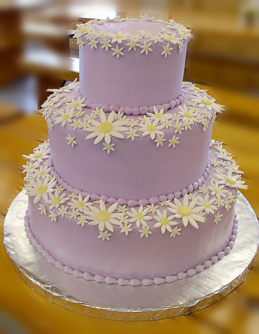 This is a 14/10/6 tiered cake. Bottom tier is a carrot cake with cream cheese icing, the middle is a white almond cake with BC icing and the top is a strawberry cake with BC icing. The daisies are made out of fondant. This was a bit of a pain trying to get the color to match between the BC and cream cheese icing, but I think I did okay.